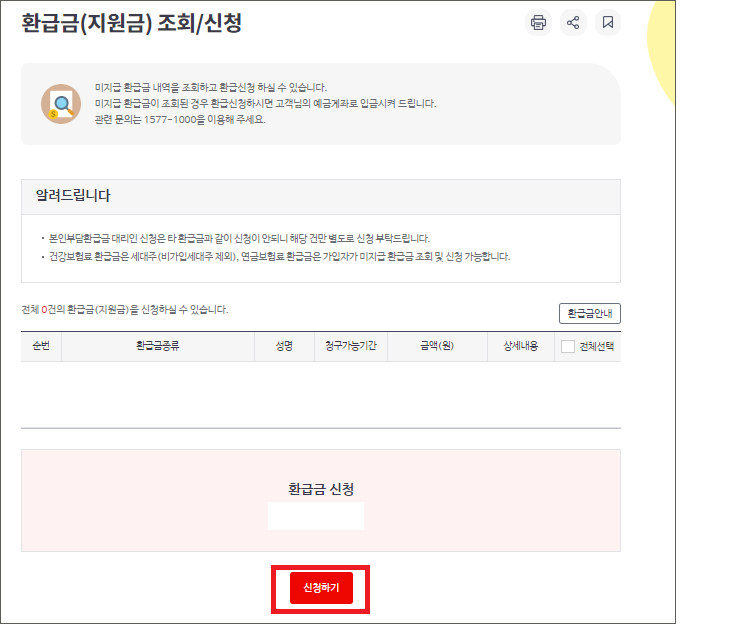 2️⃣ 메인페이지의 환급금/조회 신청을 누릅니다.