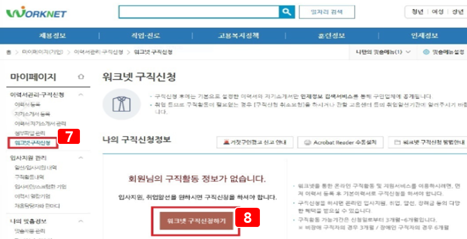 다음 마지막으로 마이페이지 → 워크넷구직신청 → 워크넷구직신청하기 버튼을 누르시면 구직신청이 완료됩니다.