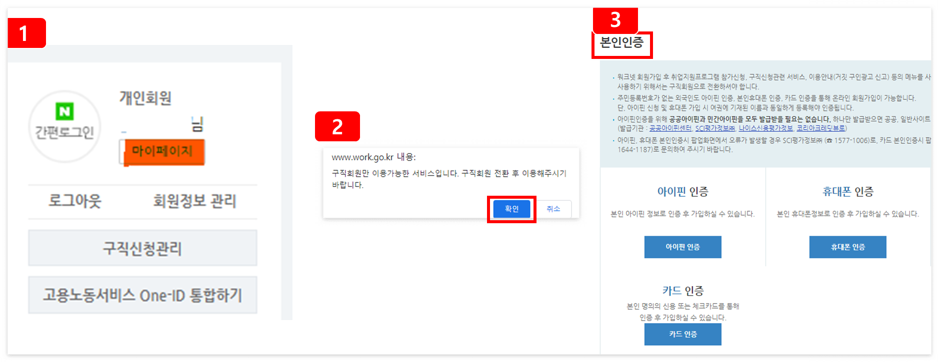 로그인 하신 후 오른쪽의 마이페이지를 클릭하시면 다음과 같이 팝업창이 나옵니다. 구직회원으로 전환을 위해 확인 버튼을 눌러주세요. 그다음으로 원하는 방법을 선택하셔서 본인인증을 해주시면 구직회원으로 전환이 됩니다.