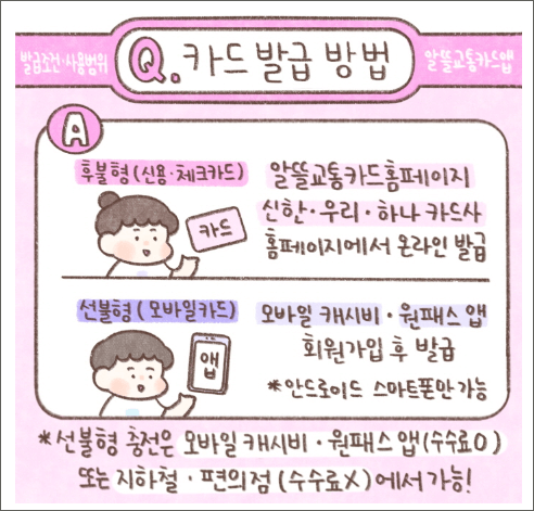 알뜰교통카드는 크게 후불형(신용카드, 체크카드)카드와 선불형카드가 있습니다. 후불형 교통카드는 교통카드 기능과 일반 카드기능이 합쳐져 있어서 카드 하나로 대중교통 이용, 편의점, 카페, 음식점 등 모두 이용이 가능합니다. 선불카드(티머니페이, 모바일캐시비, 원패스)는 일정 금액을 미리 충전해서 쓰는 형식으로 대중교통 이용시에만 사용 가능합니다.