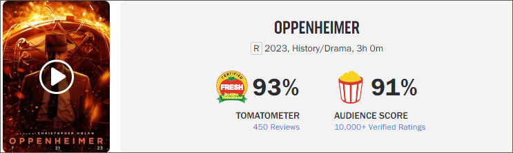 로튼토마토에서 신선도는 93%, 관객 평점은 91%로 매우 높은 평점을 받았습니다. 네이버 평점도 8.53점/10점 으로 높은 평점을 유지하고 있어 전체적으로 평점이 높은 것으로 확인할 수 있습니다.
