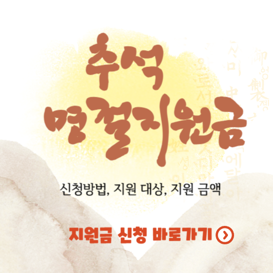 아침저녁으로 제법 날씨가 선선해지더니 이제 곧 추석이 다가옵니다. 가족들이 모이는 기쁜 날이지만 주머니 사정이 넉넉하지 않으신 분들을 위해 각 지자체에서는 추석 명절 지원금 또는 위문금을 지급하고 있습니다. 신청방법, 대상 및 금액에 대해 안내해 드리니 확인해 보시고 대상이라면 신청해 보시기 바랍니다.