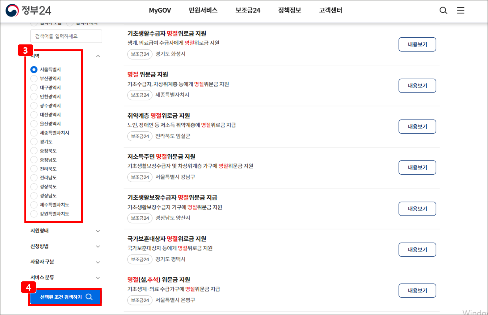 3️⃣ 전국 지자체에서 지급하고 있는 명절 지원금, 위문금을 확인하실 수 있습니다. 내가 살고 있는 곳의 지원금을 빠르게 확인하기 위해서 왼쪽 조건검색에서 [지역] 클릭 ▶[ 조회할 지역]을 선택하신 후