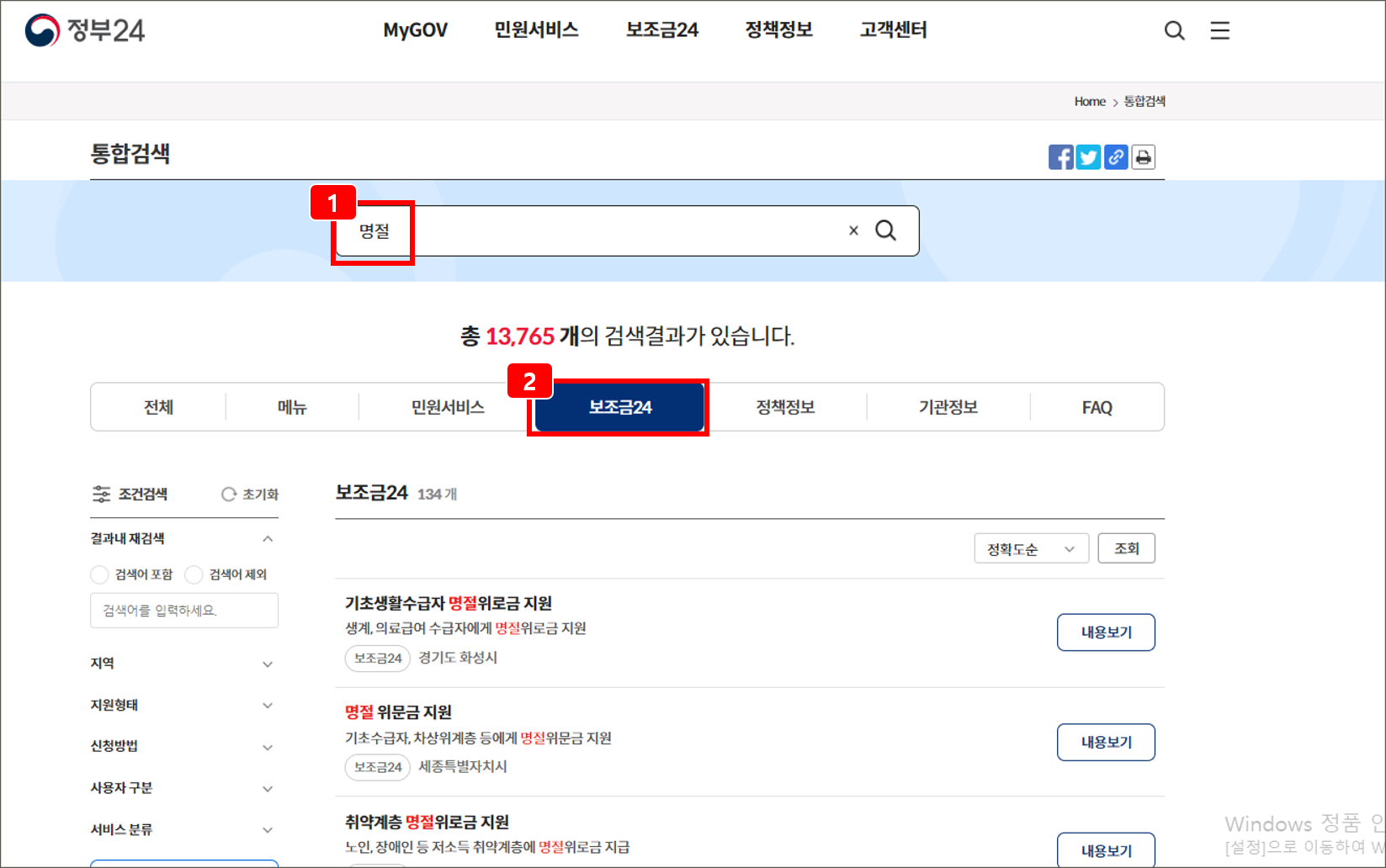 1️⃣ 정부24 홈페이지에 접속하여 명절이라고 검색합니다. 2️⃣ 여러 가지 탭 중 「보조금 24」를 선택합니다.