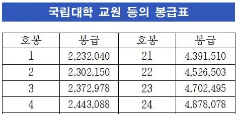 2024년 국립대학 교원의 봉급은 1호봉 기준으로 2,232,040 원입니다. 호봉별 자세한 봉급표는 아래 첨부파일에서 확인하실 수 있습니다.
