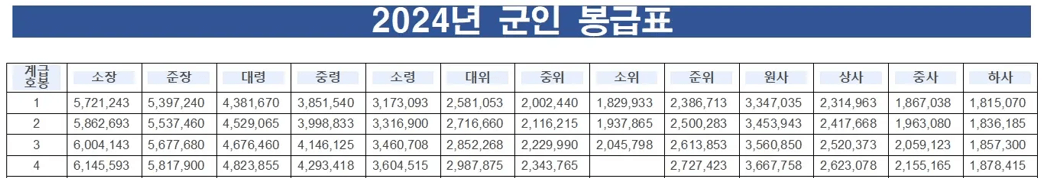 2024년 군인의 봉급은 하사 1호봉을 기준으로 1,815,070 원입니다. 계급별, 호봉별로 봉급표를 자세히 확인하시고 싶으신 분들은 아래 첨부파일에서 확인하실 수 있습니다.